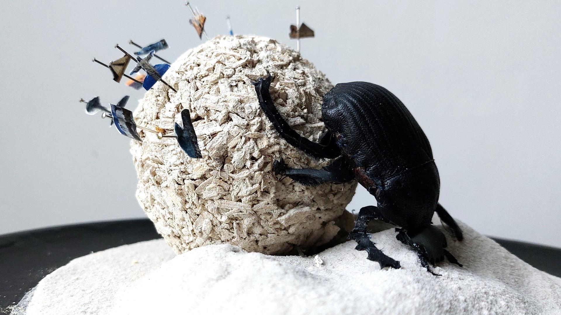 Materialen: zand, leer, kurk, verpakkingsmateriaal, ijzerdraad, binnenband, kalk/stro, papier, spelden.