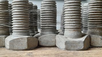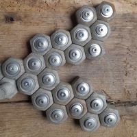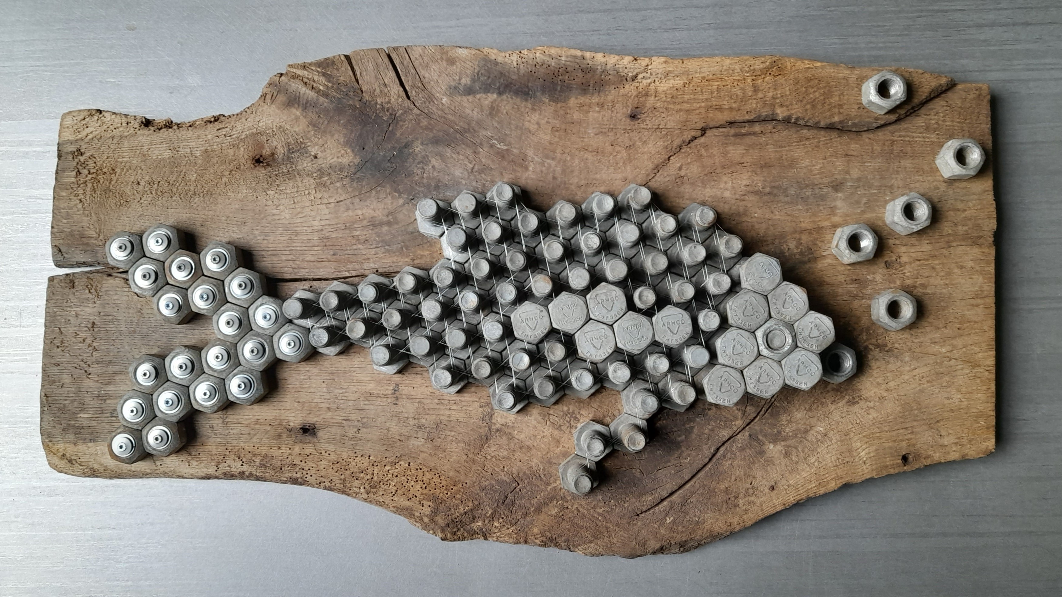 Materialen: plank varkenshok, moeren, bouten, zilverdraad
